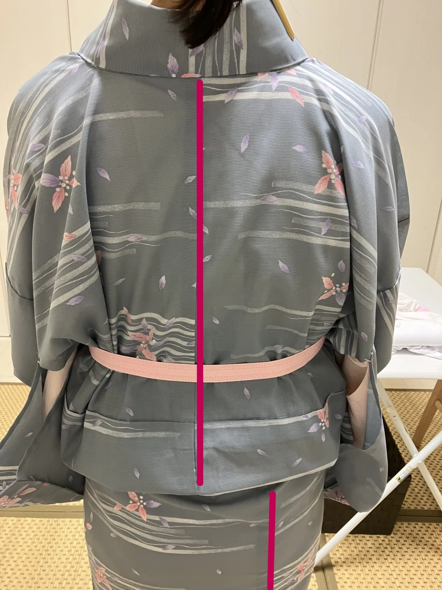 むしろ、自分の体型に着物を合わせている証拠でもあるんです。ちなみに自分の体型にあった着物を着ると、こういったズレはありませんが、それが着付けの上手下手を決めるわけではありません。