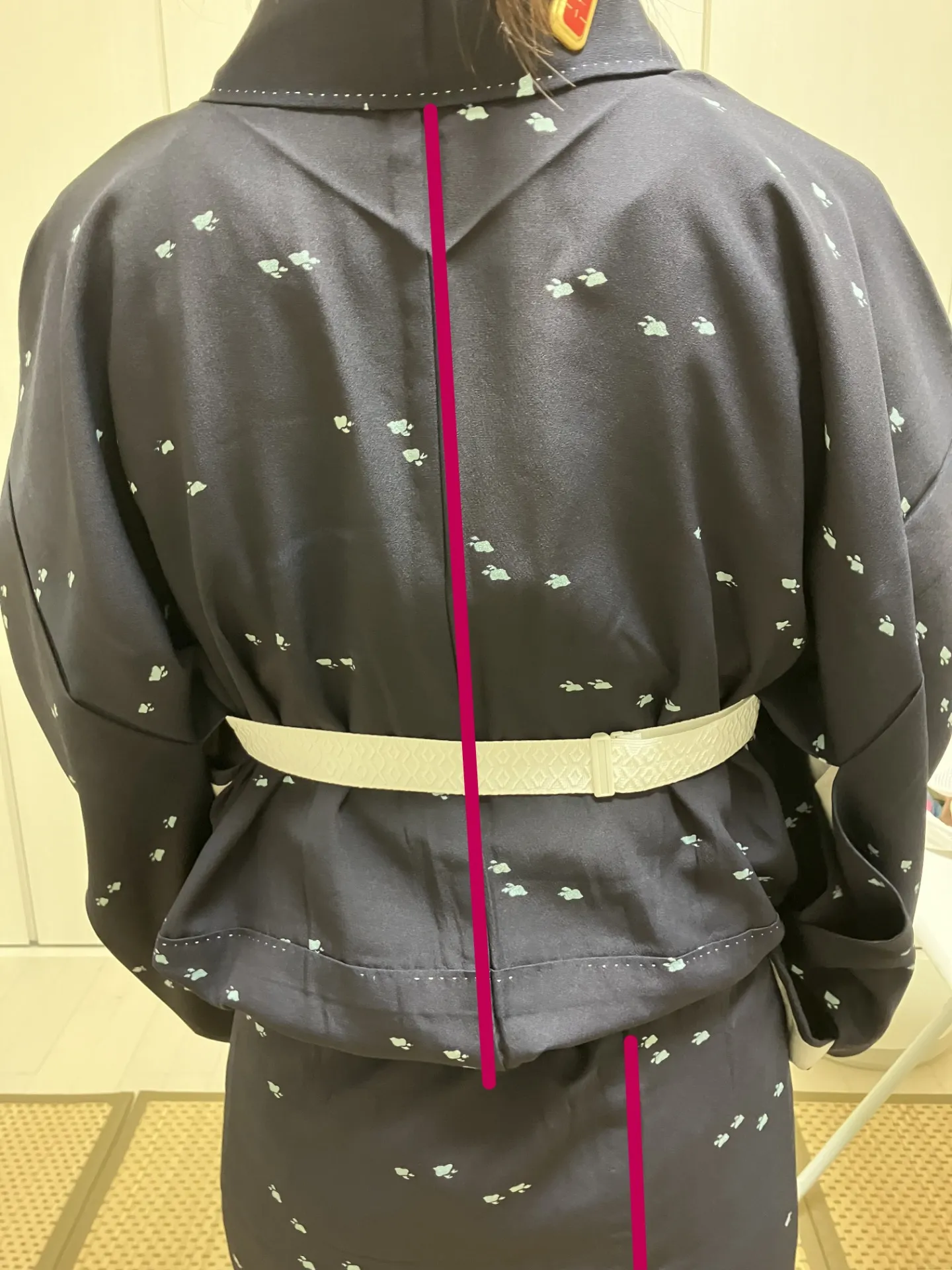 後ろ姿を撮影しました。背中心と呼ばれる縫い目が、自分の身体の中心に合っていると左右対称で綺麗なのです。上半身は背骨に沿っていますが、下半身は右にズレています。