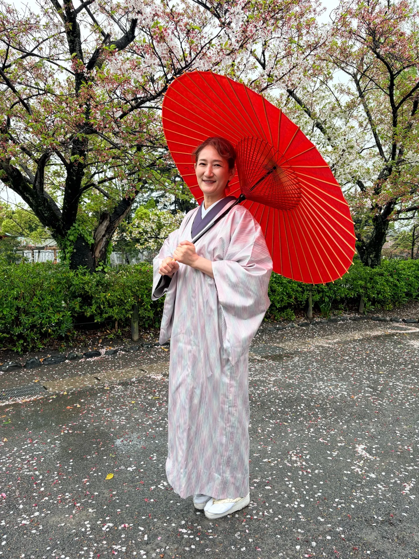 当日の嵐で散った桜の花びらが濡れた地面に広がる中、番傘をお借りしてパチリ。